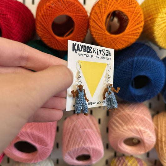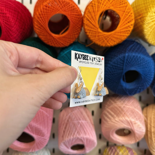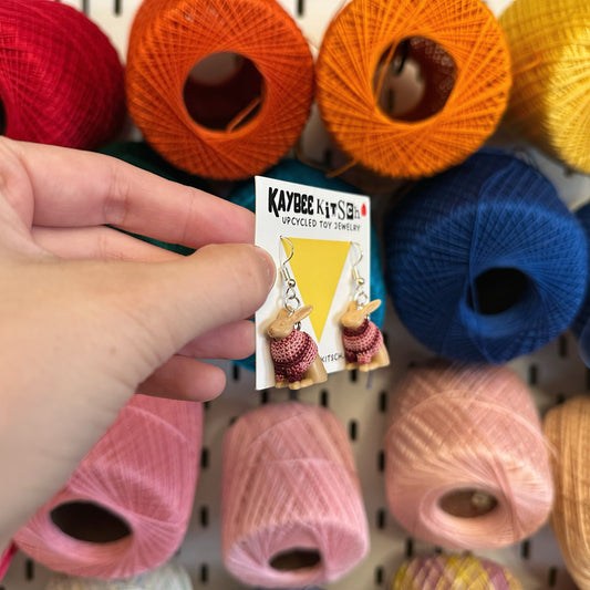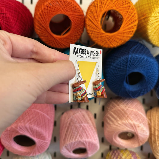 Kat of Kaybee Kitsch is best known for crocheting teeny tiny sweaters onto plastic animals, but they make all kinds of jewelry and home decor from plastic toys. They thrift the majority of the toys they use to make use of plastic that already exists in the world, crafting environmentally-friendly, nostalgic, and whimsical objects for all to enjoy.
