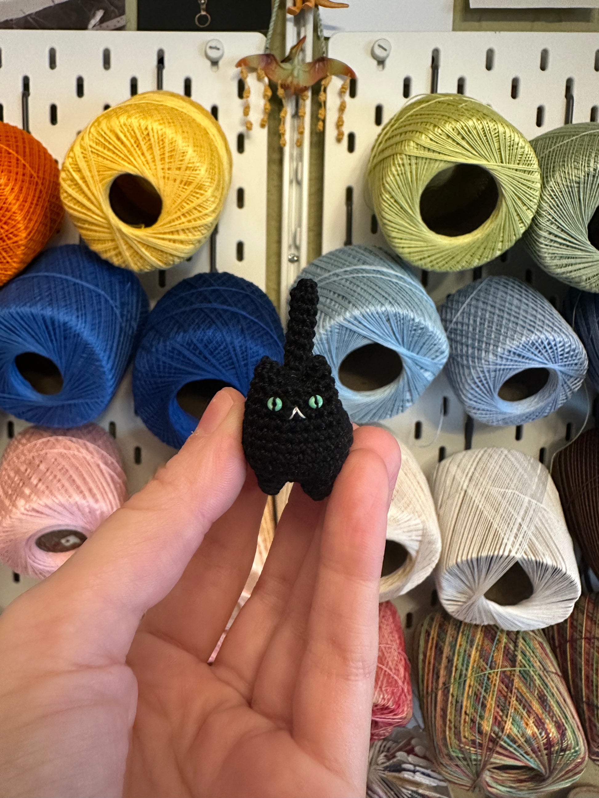 Who doesn't need the cutest, tiniest little crocheted cat in their life? Each cat is crocheted by me using Bigbebez's patterns (available here) scaled down to miniature size. They measure roughly 1" x 1.5" x 2".
