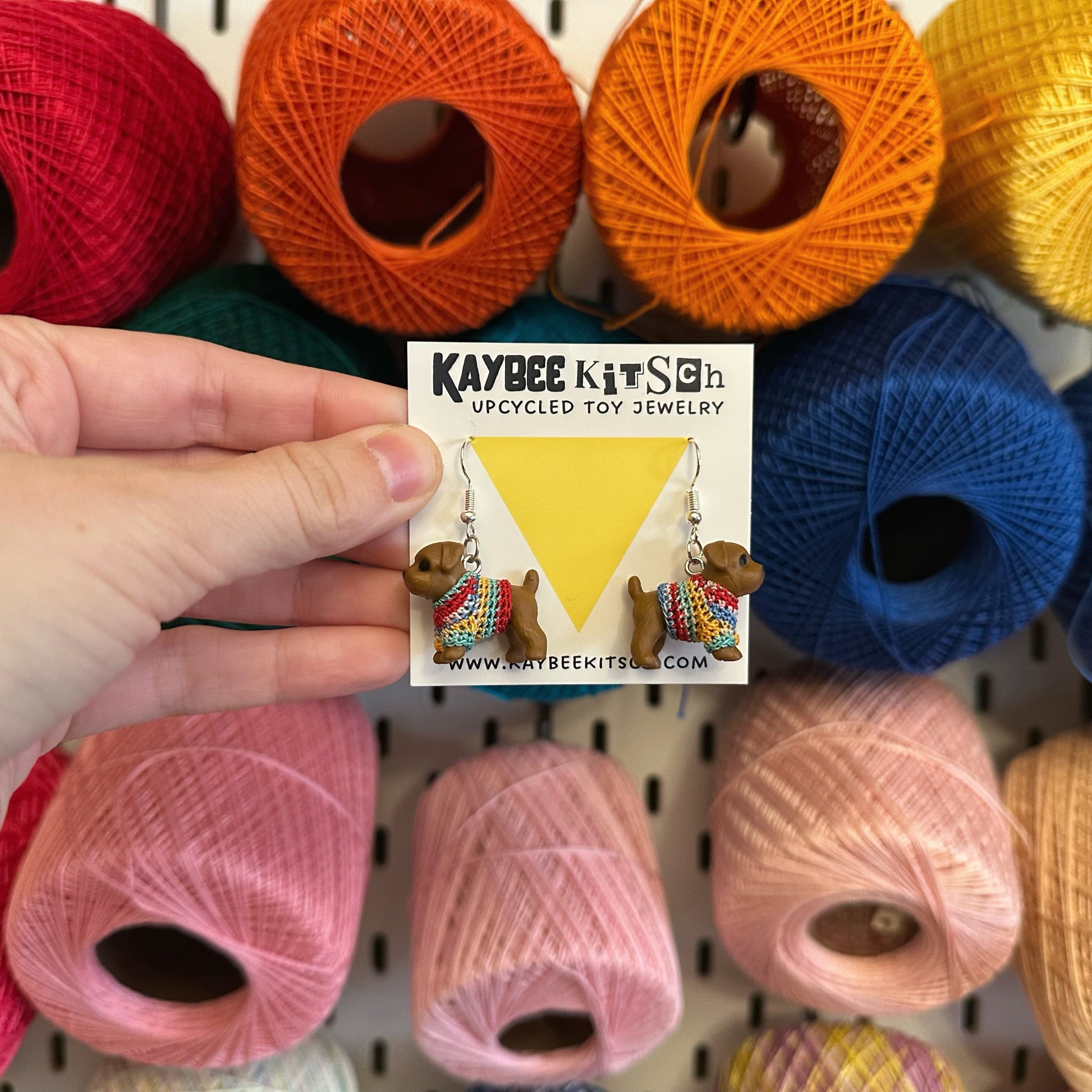 Kaybee Kitsch earrings are unique, comfortable, and will earn you compliments anywhere you go! These dogs measure 0.75" x 0.75" and are dressed up in mini crocheted sweaters.