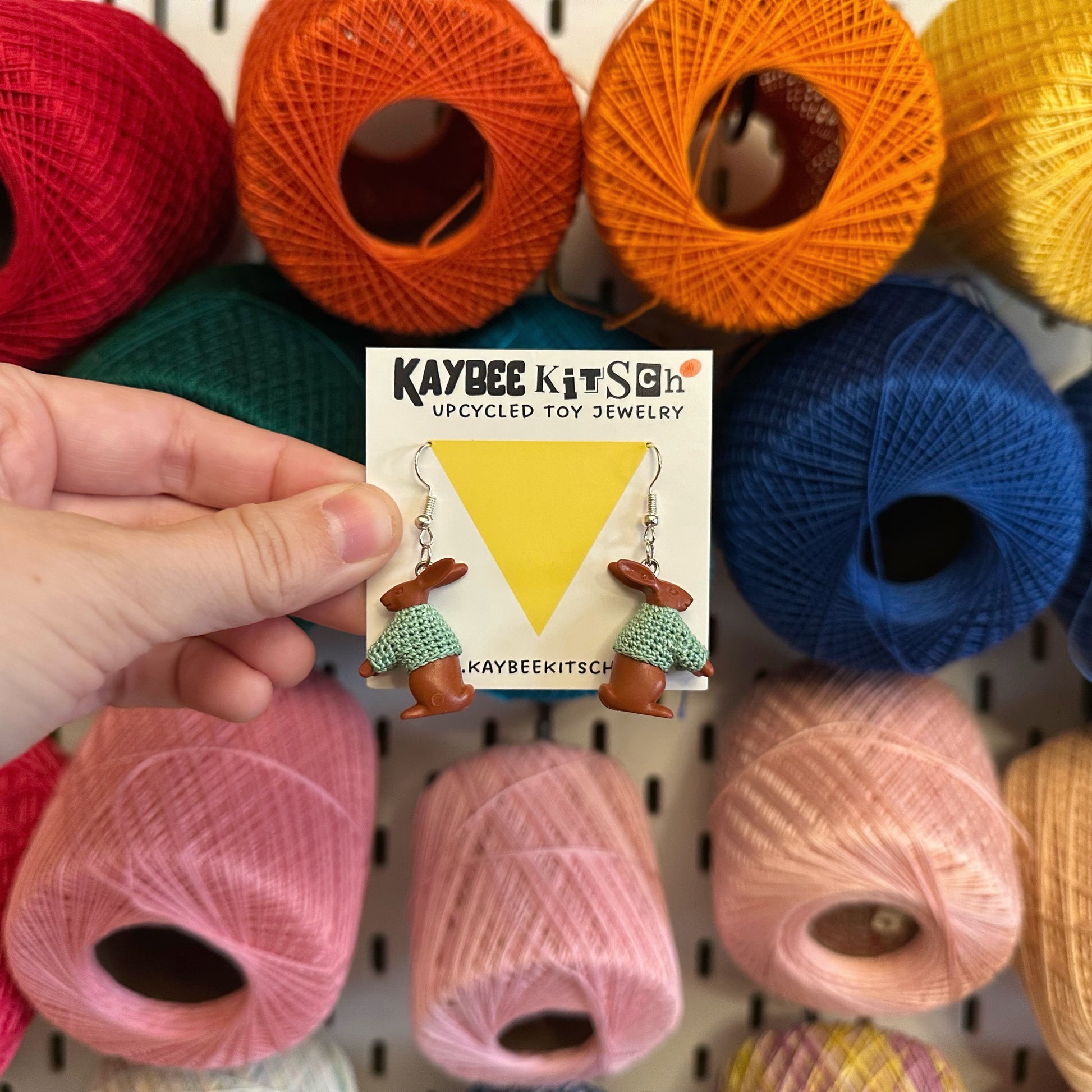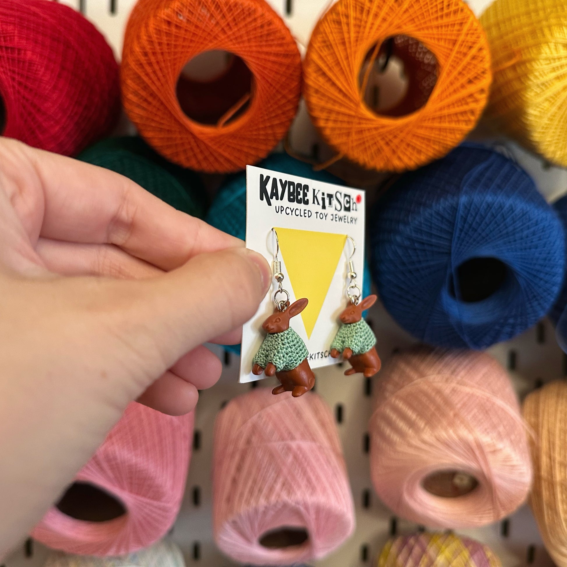 Kaybee Kitsch earrings are unique, comfortable, and will earn you compliments anywhere you go! These rabbits measure roughly 0.75" x 1" and are dressed up in mini crocheted sweaters.