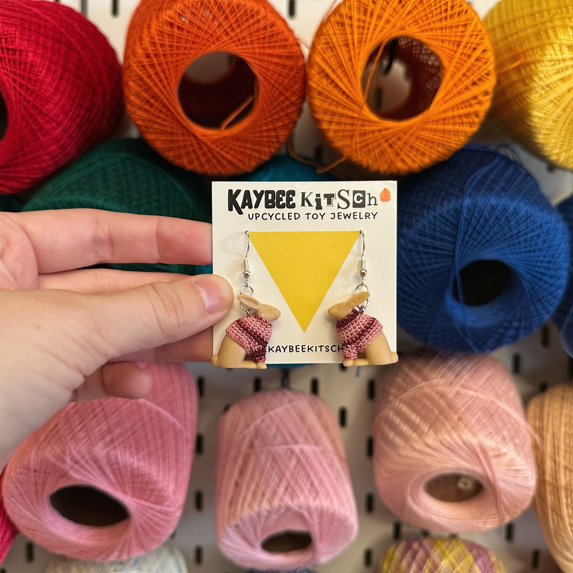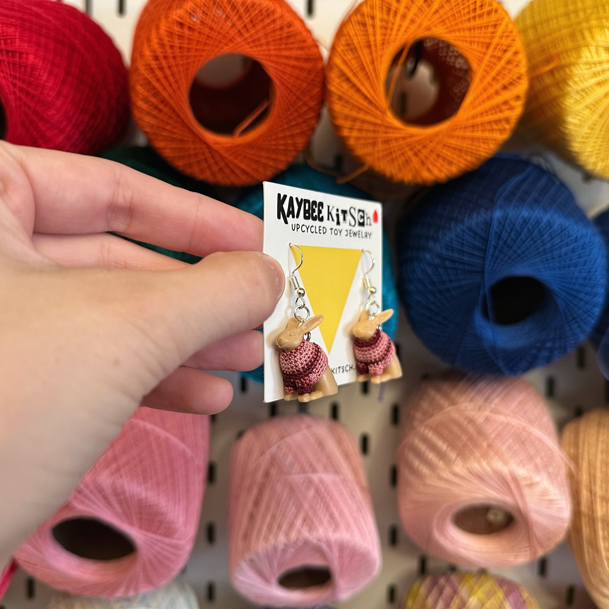 Kaybee Kitsch earrings are unique, comfortable, and will earn you compliments anywhere you go! These rabbits measure roughly 0.75" x 1" and are dressed up in mini crocheted sweaters.