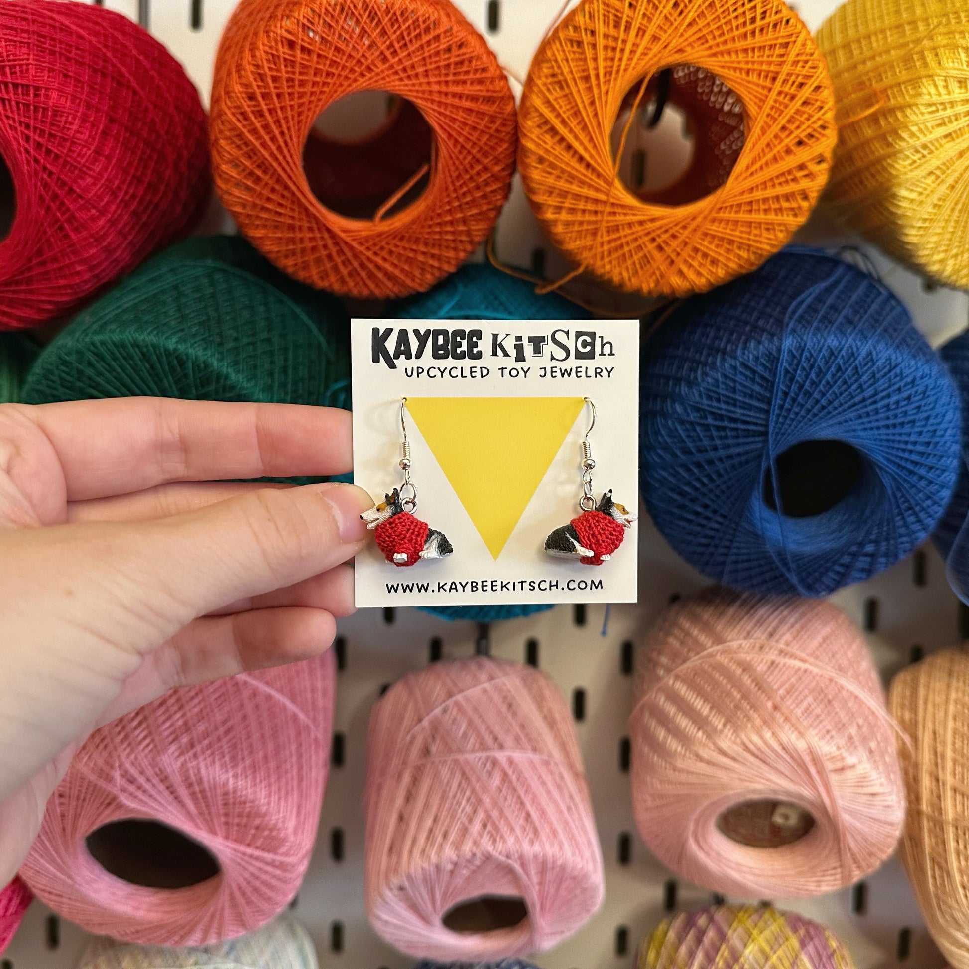 Kat Kaybee (they/them/theirs) of Kaybee Kitsch is known for collecting second-hand plastic toys and turning them into weird jewelry and decor, usually by giving them tiny hand-crocheted clothing or by cutting toys apart and piecing them together in new, upsetting ways. Every product is a unique upcycled treasure!