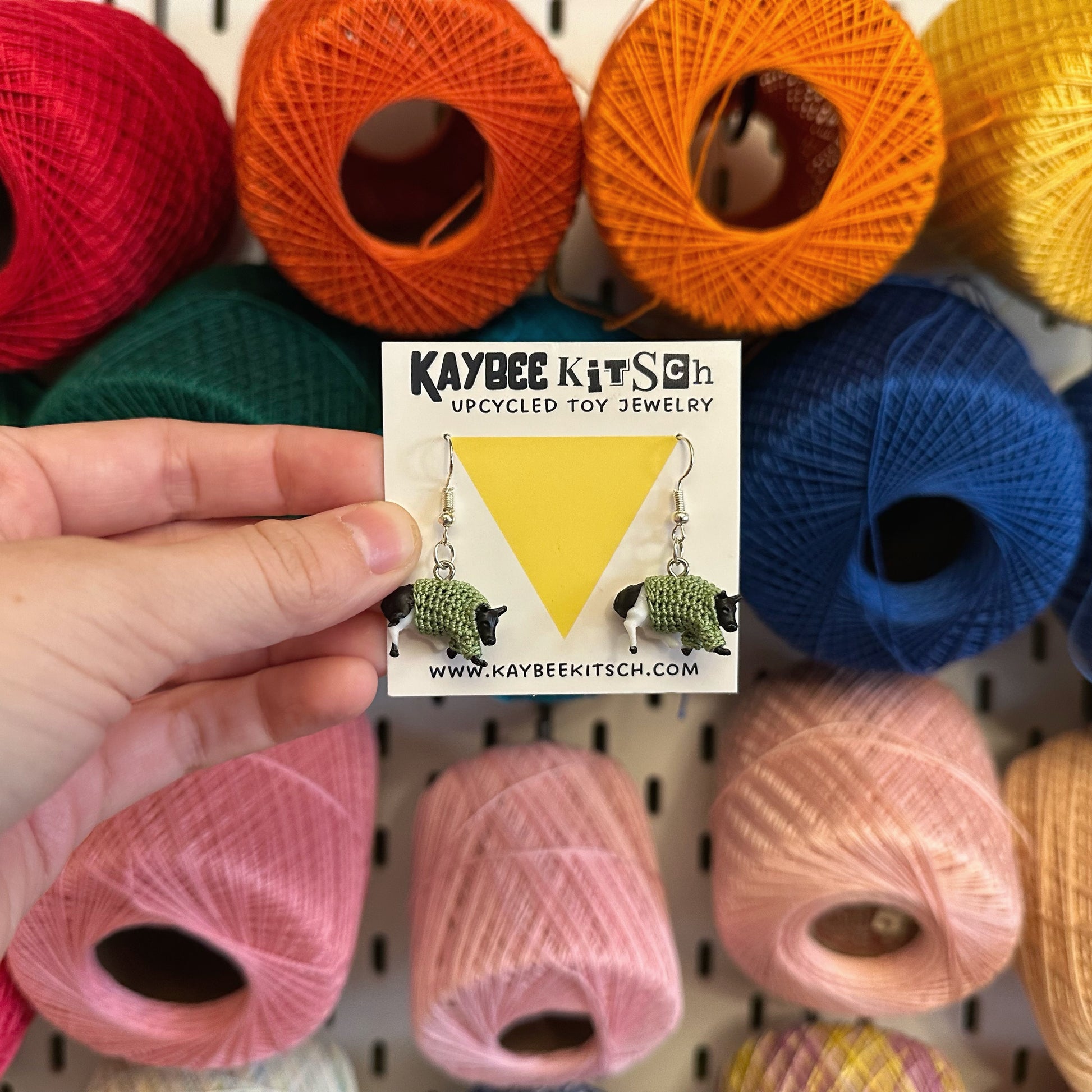 Kat Kaybee (they/them/theirs) of Kaybee Kitsch is known for collecting second-hand plastic toys and turning them into weird jewelry and decor, usually by giving them tiny hand-crocheted clothing or by cutting toys apart and piecing them together in new, upsetting ways. Every product is a unique upcycled treasure!