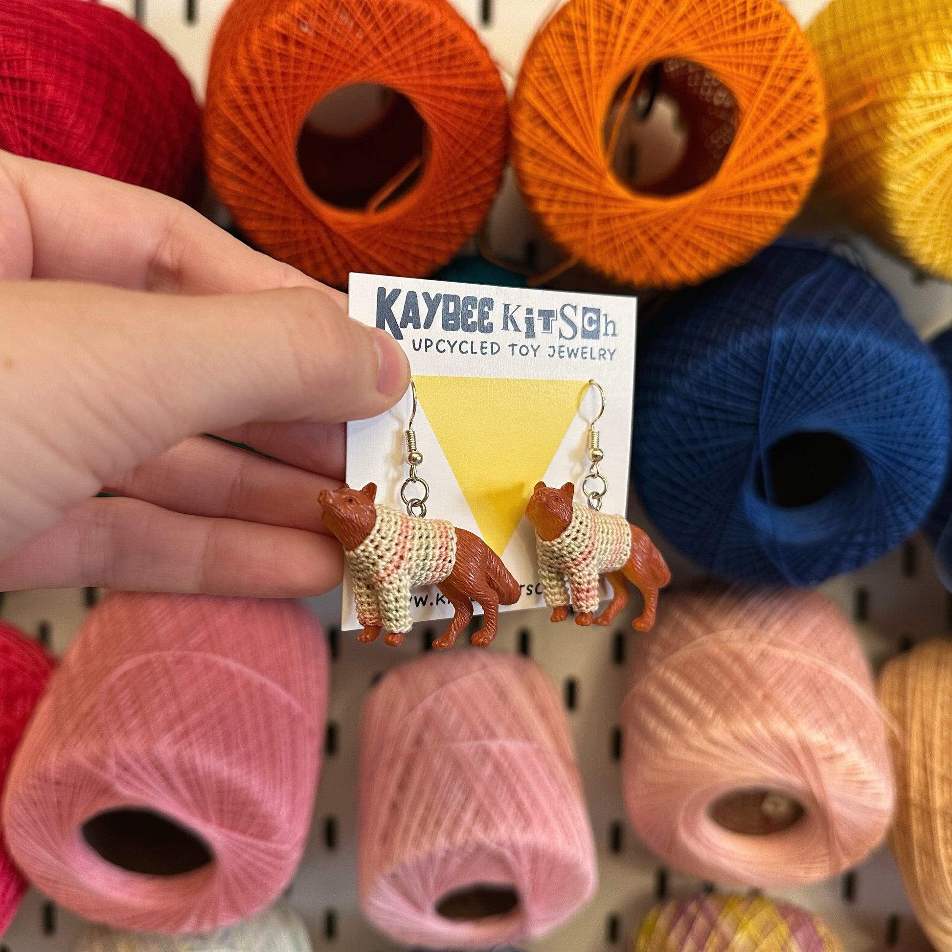 Kaybee Kitsch earrings are unique, comfortable, and will earn you compliments anywhere you go! These foxes measure 1" x 1.75" and are dressed up in mini crocheted sweaters.