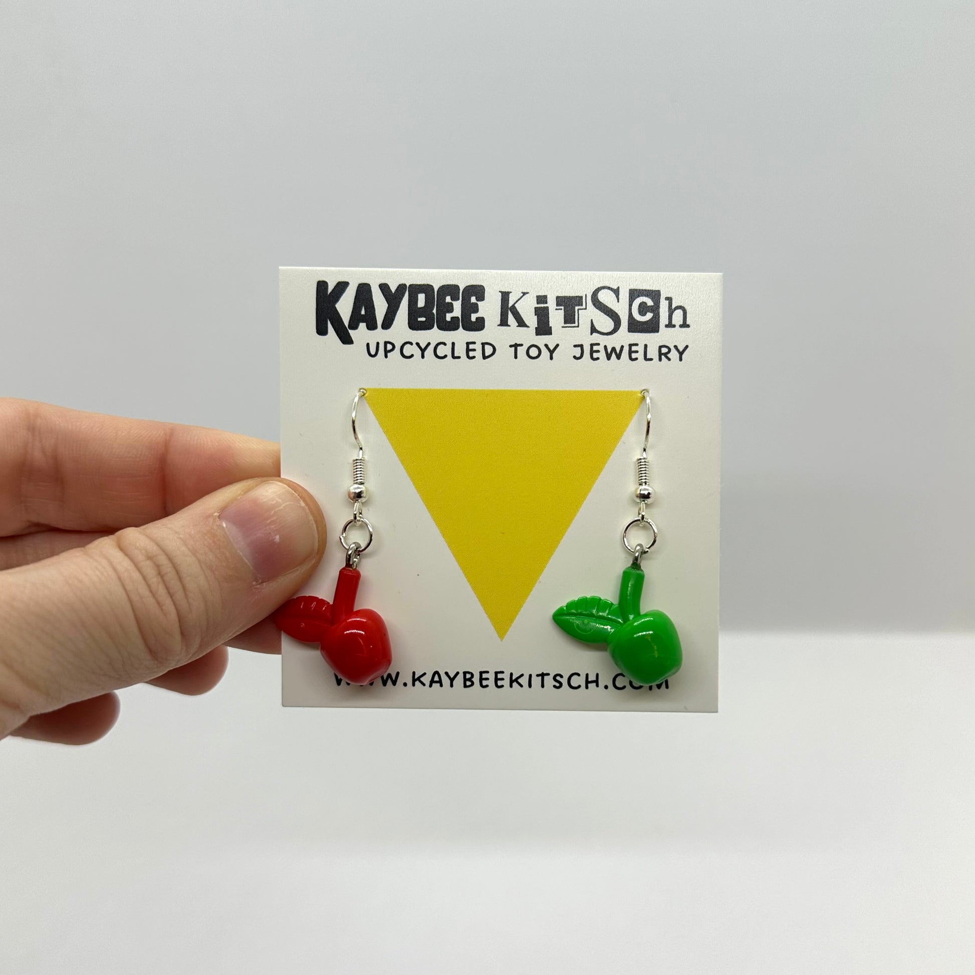 Kat Kaybee (they/them/theirs) of Kaybee Kitsch is known for collecting second-hand plastic toys and turning them into weird jewelry and decor, usually by giving them tiny hand-crocheted clothing or by cutting toys apart and piecing them together in new, upsetting ways. Every product is a unique upcycled treasure!