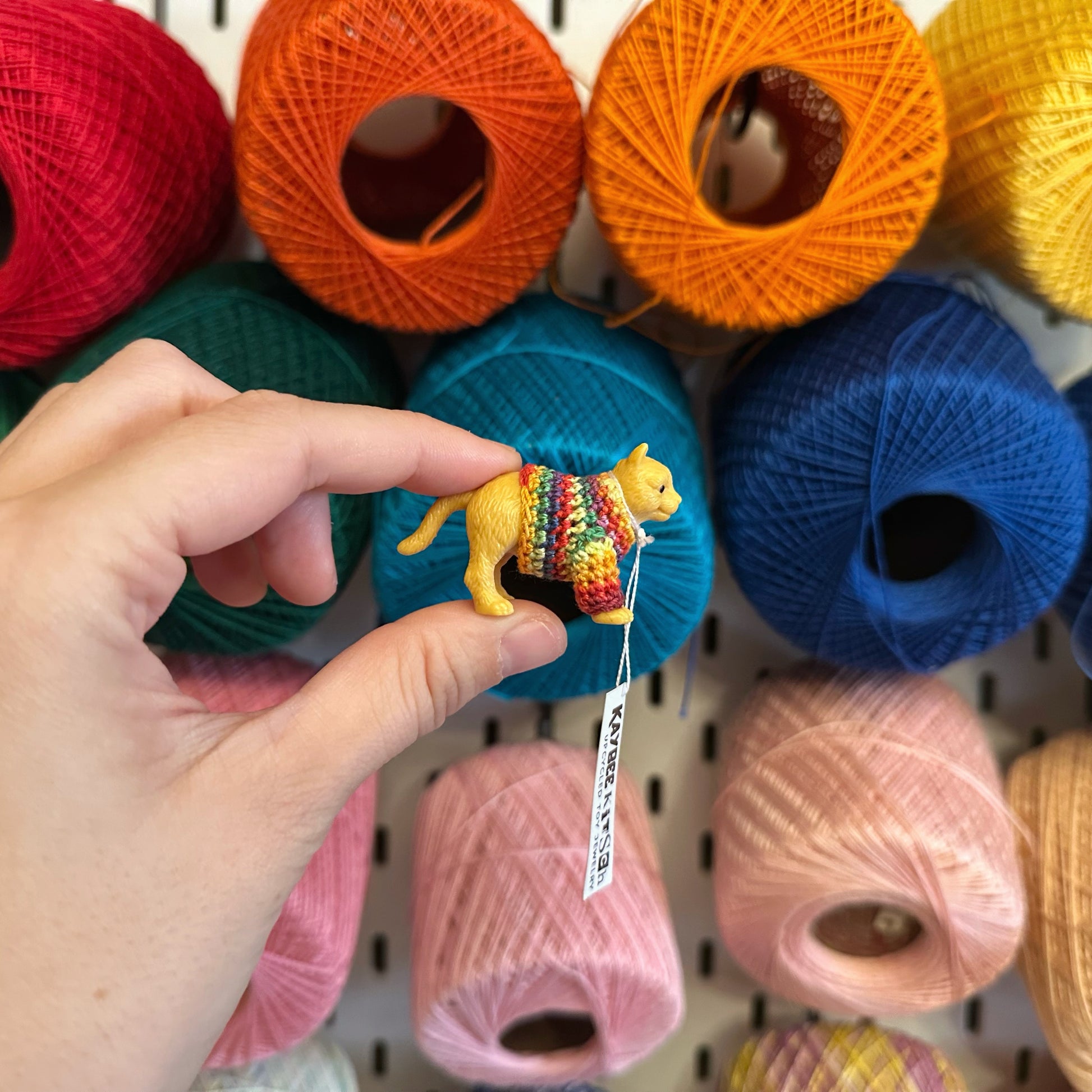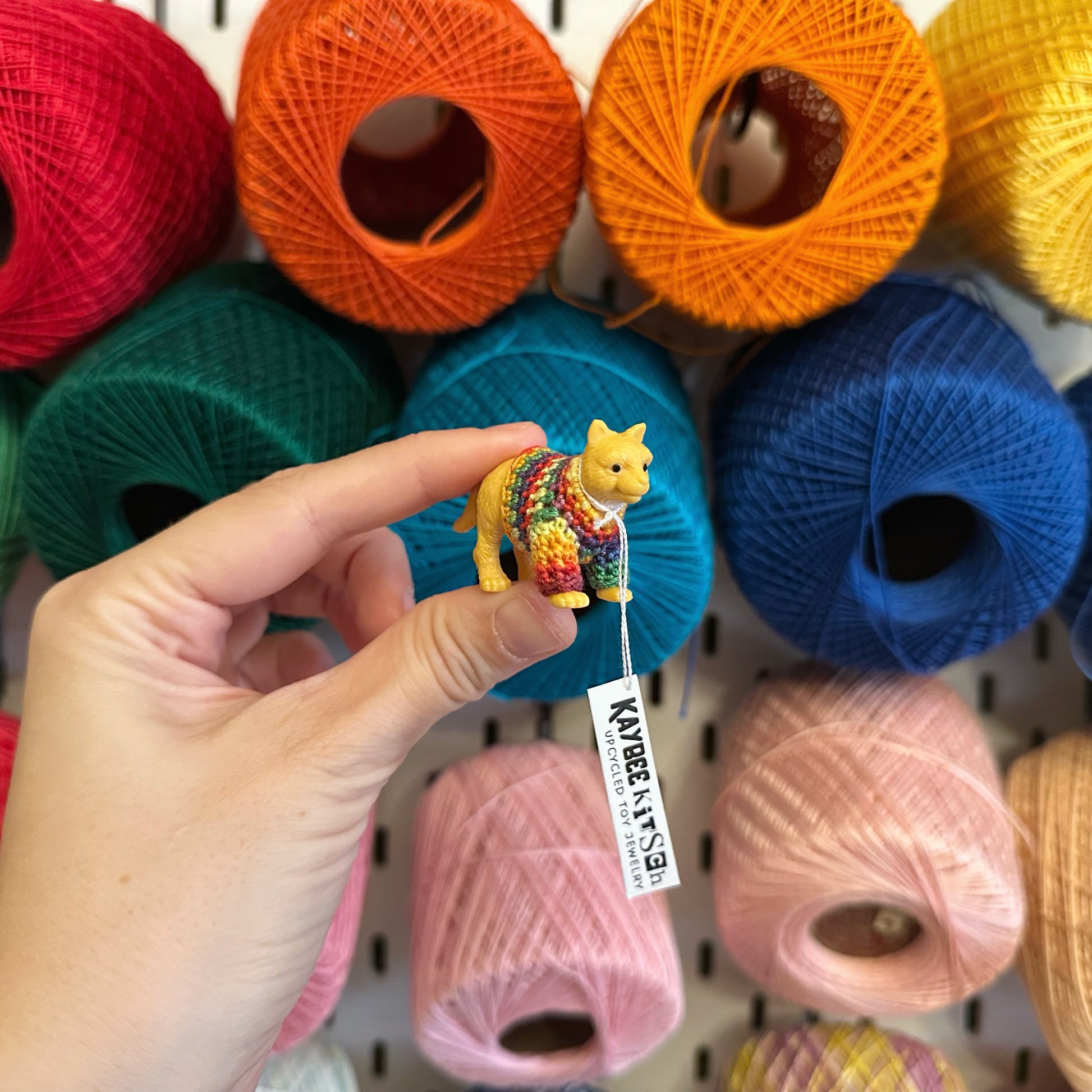 Kaybee Kitsch figurines will bring some fun to anyone's desk or trinket shelf. This cat measures 1" x 1.5" and is dressed in a mini rainbow sweater.