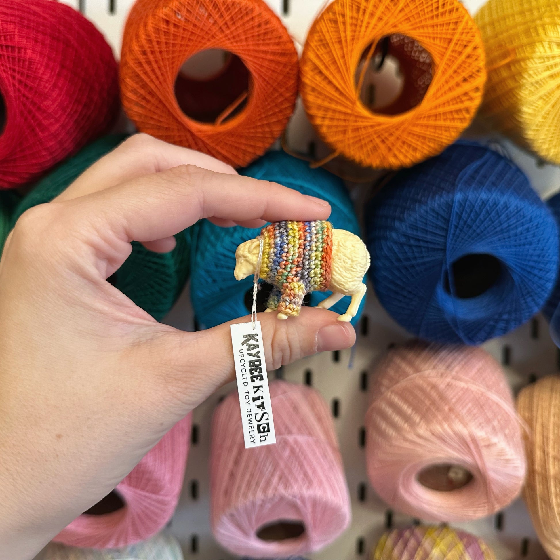 Kaybee Kitsch figurines will bring some fun to anyone's desk or trinket shelf. This sheep measures 1.5" x 2" and is dressed in a mini crocheted sweater.