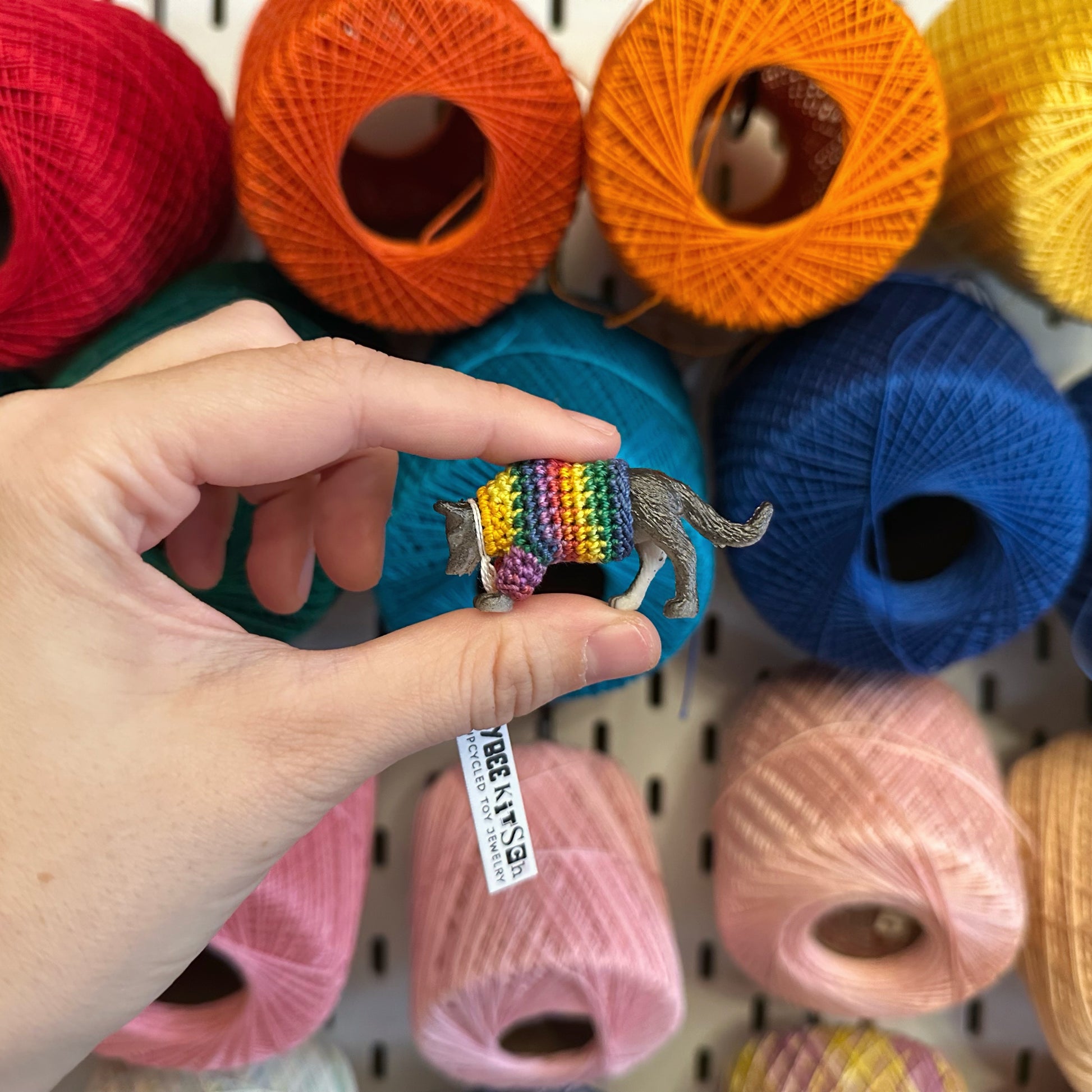 Kat Kaybee (they/them/theirs) of Kaybee Kitsch is known for collecting second-hand plastic toys and turning them into weird jewelry and decor, usually by giving them tiny hand-crocheted clothing or by cutting toys apart and piecing them together in new, upsetting ways. Every product is a unique upcycled treasure!
