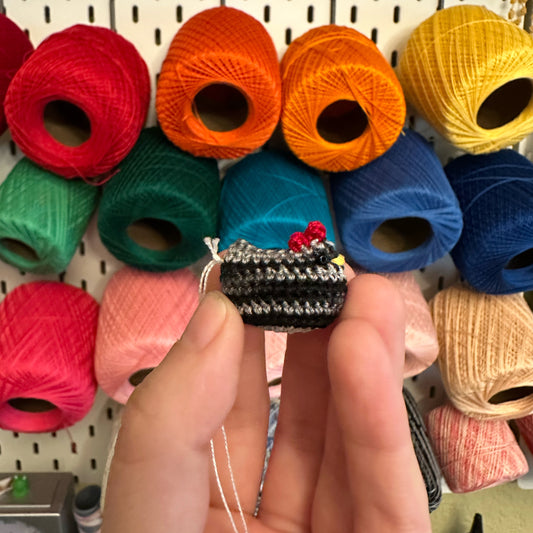 Kat of Kaybee Kitsch is best known for crocheting teeny tiny sweaters onto plastic animals, but they make all kinds of jewelry and home decor from plastic toys. They thrift the majority of the toys they use to make use of plastic that already exists in the world, crafting environmentally-friendly, nostalgic, and whimsical objects for all to enjoy.